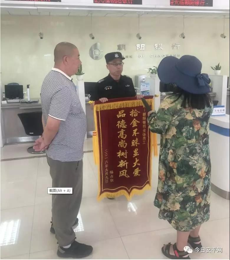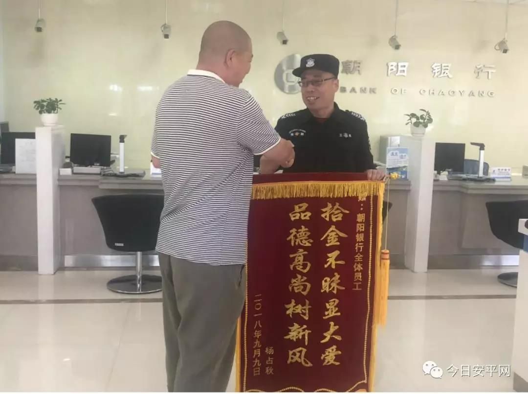 “匯通支行的員工不僅服務(wù)態(tài)度好,辦事效率高,而且拾金不昧,品德高尚,要不是你們的工作人員,我昨天的 2500 元錢就丟了,實(shí)在太感謝你們了,今天,我給咱朝陽銀行的員工們送錦旗來了……”,楊大爺進(jìn)門拉著我行保安王福洲的手激動(dòng)的說。
