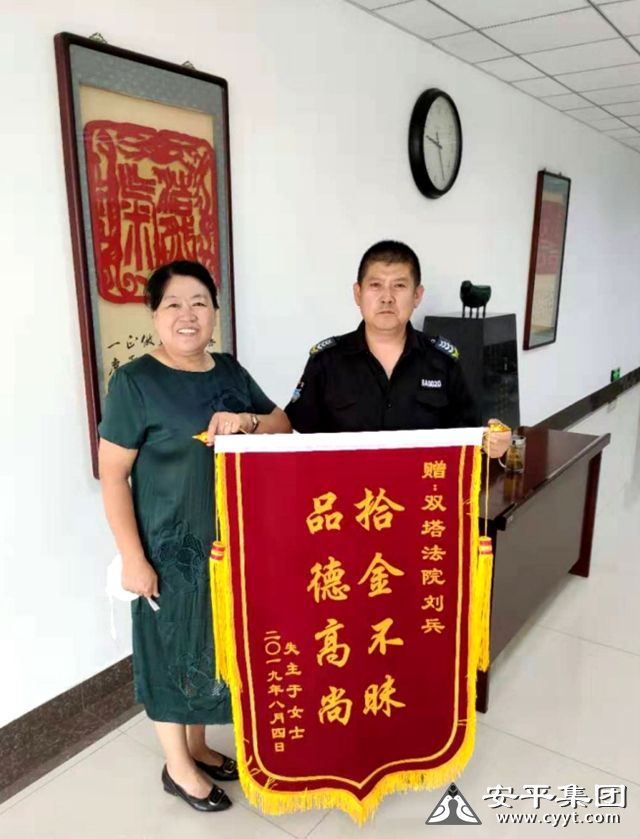 劉兵是遼寧朝陽(yáng)安平集團(tuán)駐朝陽(yáng)市雙塔區(qū)人民法院的一名保安員。8月4日,劉兵趁午休時(shí)間去銀行辦理業(yè)務(wù),在ATM自動(dòng)取款機(jī)上發(fā)現(xiàn)了一個(gè)手包。由于是周日,又是中午,銀行辦理業(yè)務(wù)的人員很少,他見(jiàn)手包無(wú)人認(rèn)領(lǐng)便意識(shí)到一定是有人遺落的。當(dāng)他打開(kāi)手包,發(fā)現(xiàn)內(nèi)有厚厚一沓現(xiàn)金,還有身份證、銀行卡等多種證件。劉兵心想,丟失了這么重要的東西,失主一定會(huì)返回尋找,于是就在原地等了起來(lái),這一等就是40多分鐘。等待無(wú)果后,還沒(méi)吃午飯且著急返回崗位的劉兵正想著將手包交給警察處理時(shí),一位女士滿頭大汗地跑進(jìn)銀行。通過(guò)觀察,劉兵猜測(cè)該女士可能是失主,便上前詢問(wèn)。經(jīng)過(guò)一番核對(duì),確認(rèn)手包是這位于女士的,便將其物歸原主。于女士非常感激他,當(dāng)即從10000多元的現(xiàn)金里抽出2000元作為酬謝,被劉兵婉言拒絕。他語(yǔ)氣堅(jiān)定地對(duì)于女士說(shuō):“我是安平集團(tuán)的保安員,不能破壞了我們安平人的形象!”